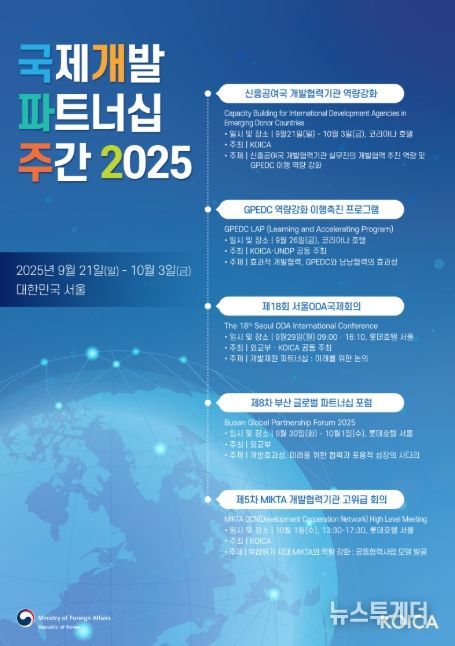 뉴스투게더 임장균 기자 | 외교부는 9월 21일~10월 3일 간 서울에서 한국국제협력단(KOICA)과 공동으로 '2025 국제개발 파트너십 주간'을 개최한다.