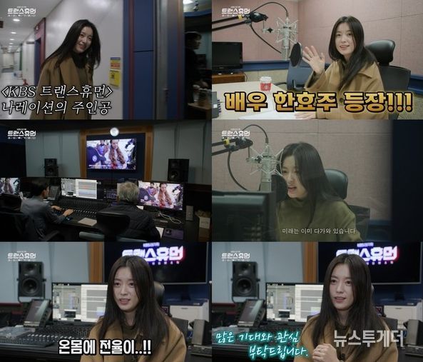 'KBS 다큐' 유튜브 채널에 올라온 메이킹 필름 영상에서는 밝은 표정으로 녹음실에 들어선 한효주가 꾸미지 않은 내추럴한 미모로 먼저 감탄을 자아냈다.