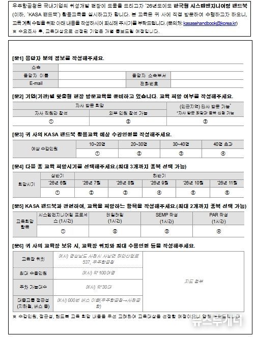 뉴스투게더 김인숙 기자 | 우주항공청은 위성개발 현장을 방문하는 한국형 시스템엔지니어링 핸드북(이하 ‘KASA 핸드북’) 활용 교육을 위한 수요조사를 1월 19일부터 실시한다.