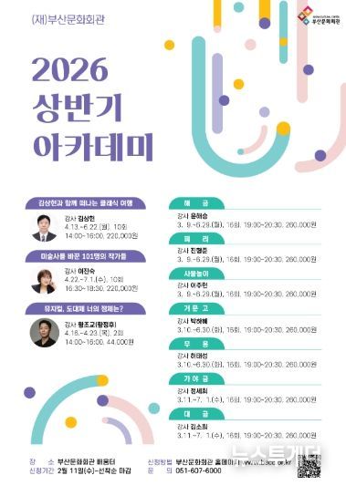 뉴스투게더 김인숙 기자 | (재)부산문화회관은 오는 3월 9일부터 7월 1일까지 2026년도 상반기 정규 아카데미 강좌를 개설한다.