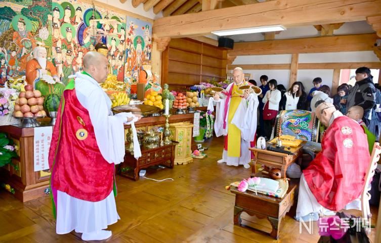 이번 법회가 열린 산신각은 지난해 6월 화재로 소실됐다가 총 4억 5천만원의 사업비를 지원받아 복원됐으며, 낙성 법회에 앞서 바라춤과 승무, 독경, 법문 등 불상 점안식 의식이 엄숙하게 진행됐다.