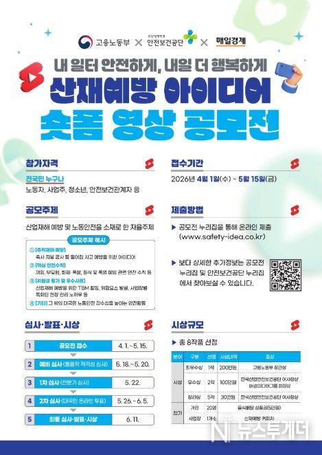 뉴스투게더 김태훈 기자 | 고용노동부는 한국산업안전보건공단, ㈜매일경제신문사와 함께 국민 누구나 참여할 수 있는 산재예방 아이디어 숏폼 영상 공모전를 개최한다.