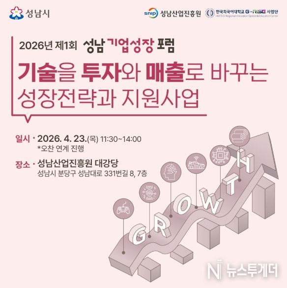 뉴스투게더 이현진 기자 | 성남산업진흥원은 4월 23일 11시 30분부터 성남산업진흥원 대강당에서 '2026년 제1회 성남기업성장포럼'을 개최한다. 이번 행사는 기술 기반 투자유치와 중동사태 대응 방안을 중심으로 성남 기업의 매출 성장과 글로벌 진출을 모색한다.