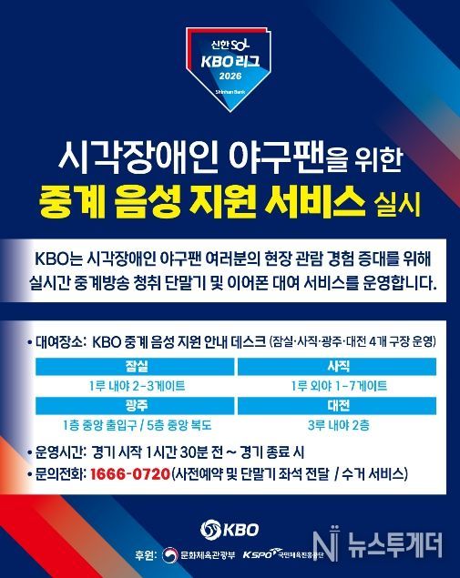 뉴스투게더 윤종우 기자 | KBO는 2023년부터 잠실, 사직, 광주 구장에서 운영해 온 ‘KBO 리그 시각장애인 현장 관람객 대상 중계 음성 지원 서비스’를 올해 대전 한화생명 볼파크까지 확대해 총 4개 구장에서 운영한다.
