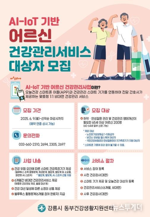 뉴스투게더 김재윤 기자 | 강릉시는 지역 어르신의 건강한 노후 생활을 지원하기 위해 오는 6월 9일(월)부터 AI·IoT 기반 어르신 건강관리사업의 8기 대상자 200명을 선착순 마감 시까지 모집한다고 밝혔다.