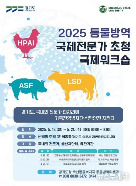 뉴스투게더 김재윤 기자 | 경기도는 5월 19일부터 21일까지 3일간 여주 썬밸리 호텔에서 ‘2025년 동물방역 국제전문가 초청 국제워크숍’을 개최한다고 7일 밝혔다.