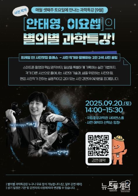 과학기술정보통신부 국립중앙과학관은 매월 셋째 주 토요일에 개최하는 ‘별의별 과학특강’의 9월 강연에 사진 분야에서는 개성 있는 작품 세계로 잘 알려진 두 명의 전문작가 안태영과 이요셉을 초청해 강연을 개최한다고 밝혔다. 안태영 작가는 일상의 순간을 특별하게 담아내는 ‘타임그래퍼’로, 스마트폰을 활용해 평범한 풍경을 낭만적인 장면으로 기록하는 작업으로 주목 받고 있다. 이요셉 작가는 다큐멘터리 사진 작가로 사진과 영상, 글과 그림을 결합한 스토리텔링 작업으로 잘 알려져 있으며 NGO와의 협업, 구호 활동 참여 등 사회적 메시지를 담은 작품 활동도 활발하다.