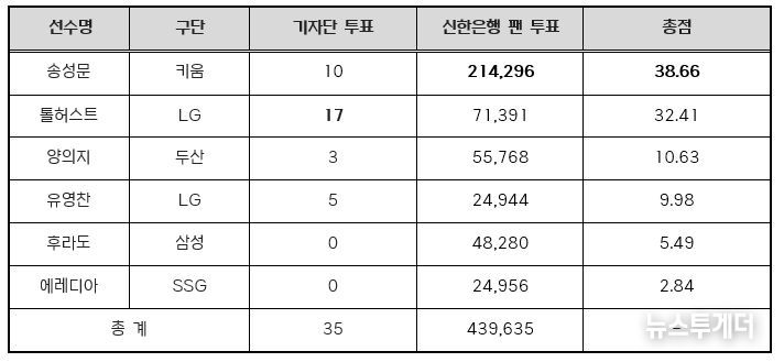송성문은 기자단 투표 총 35표 중 10표(28.6%), 팬 투표 43만 9,635표 중 21만 4,296 표(48.7%)로 총점 38.66점을 받아, 기자단 투표 17표, 팬 투표 7만 1,391표로 총점 32.41점을 기록한 LG 톨허스트를 제쳤다.