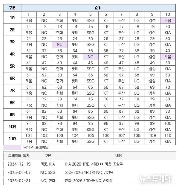 KBO 규약에 따라 2026 신인 지명권이 선수와 트레이드 된 사례는 3차례, 총 4개의 지명권 이동이 있었다. NC는 한화와 SSG로부터 각각 양수 받은 3, 4라운드 지명권을, 키움은 KIA로부터 양수 받은 1, 4라운드 지명권을 갖는다. 따라서 전 구단이 모든 지명권을 행사할 경우, 키움과 NC는 13명, 한화와 SSG는 10명, KIA는 9명, 이외 구단들은 11명의 선수를 지명하게 돼, 총 110명의 선수가 KBO 리그 구단 유니폼을 입게 된다.