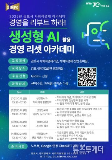 뉴스투게더 이현진 기자 | 김포시는 사회적 경제기업의 인공지능 활용도를 높이기 위해 ‘생성형 인공지능(AI) 활용, 경영 리셋 아카데미’를 개설한다.