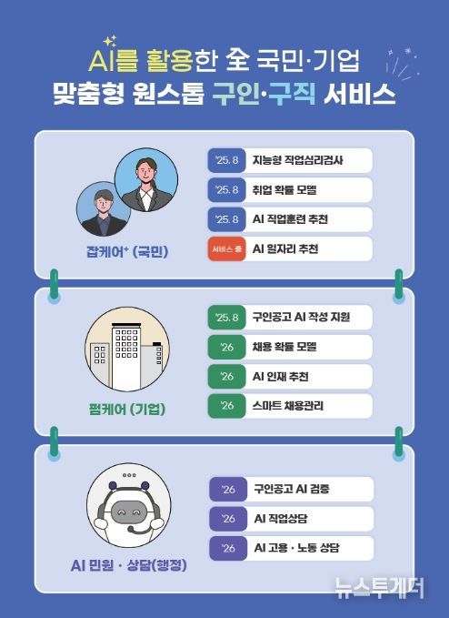 2025년에는 직업탐색에서부터 역량 분석‧개발, 직업훈련‧일자리 추천까지 '구직자 맞춤형 원스톱 취업지원 서비스(잡케어+)'를 구축하고, 2026년에는 구인공고 작성부터 채용 확률, 인재 추천까지 신속한 인재 확보를 위한 '구인기업 맞춤형 원스톱 채용지원 서비스(펌케어)'를 구현할 예정이다.