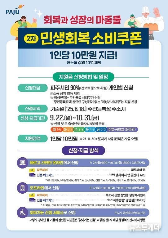 뉴스투게더 이현진 기자 | 파주시는 소비 활성화 및 자영업자 매출 확대를 통한 민생경제 회복을 위해 정부가 추진하는 ‘민생회복 소비쿠폰’ 2차 지급을 오는 22일부터 10월 31일까지 실시한다고 밝혔다.