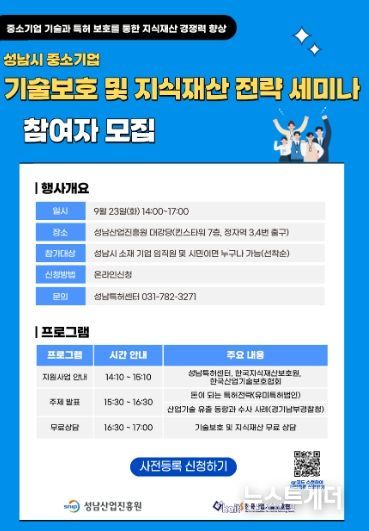 이번 세미나는 성남산업진흥원, 한국산업기술보호협회, 한국지식재산보호원, 경기남부경찰청이 공동 주최하며, 중소기업이 반드시 알아야 할 기술보호 핵심 내용과 지식재산 전략을 소개한다.