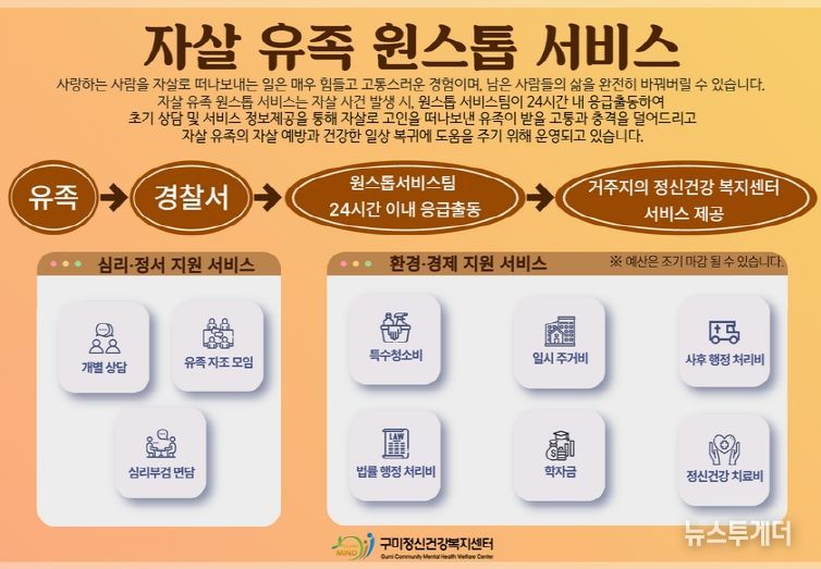 뉴스투게더 김인숙 기자 | 구미시는 7월부터 자살로 갑작스럽게 가족을 잃은 유족들의 고통을 신속히 완화하고 안정적인 일상 복귀를 위해 '자살 유족 원스톱 서비스'사업을 본격 운영하고 있다.