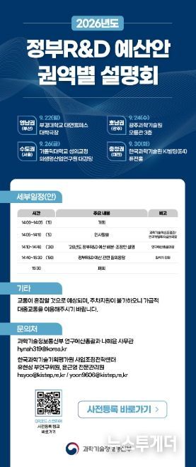 뉴스투게더 김인숙 기자 | 과학기술정보통신부 과학기술혁신본부는 9월 22일부터 수도권, 충청권, 호남권, 영남권 등 4개 권역에서 2026년도 국가연구개발사업 예산안 권역별 설명회를 개최한다고 밝혔다.