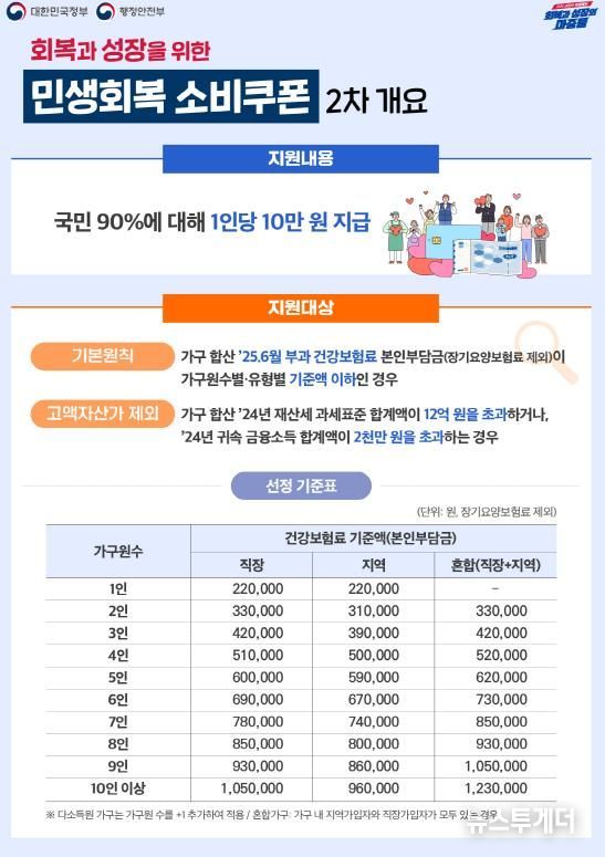 지원 금액은 1인당 10만 원으로 2025년 6월 부과 본인부담 건강보험료 가구별 합산액이 선정기준 이하로, 가구원의 2024년 재산세 과세표준 합계액이 12억 원을 초과하지 않거나 2024년 귀속 금융소득 합계액이 2천만 원을 초과하지 않는 경우다.