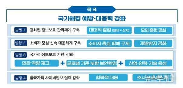 '범부처 정보보호 종합대책'의 주요 추진 방향으로는 ❶국민 생활에 밀접한 핵심 IT 시스템의 대대적인 보안 점검을 추진하고, ❷소비자 중심의 사고 대응 체계 구축과 재발 방지 대책의 실효성을 강화한다. 아울러 ❸민·관 전반의 정보보호 역량을 강화하는 한편, 글로벌 기준에 부합하는 정보보호 환경 조성과 정보보호 산업·인력·기술을 육성하고, 마지막으로 ❹범국가적 사이버안보 협력 체계를 강화한다.