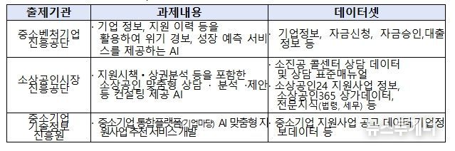 이번 공모전에 과제를 출제하는 기관은 총 3곳*으로 ▲중소기업 성장·위험 예측, ▲소상공인 맞춤형 전문상담(컨설팅), ▲중소기업 통합플랫폼 기반 지원사업 추천 3개 분야 과제를 제출하고 기관들이 보유한 양질의 데이터를 제공한다. 각 기관에서 제공하는 데이터는 가공 및 비식별화해 제공될 예정이다.