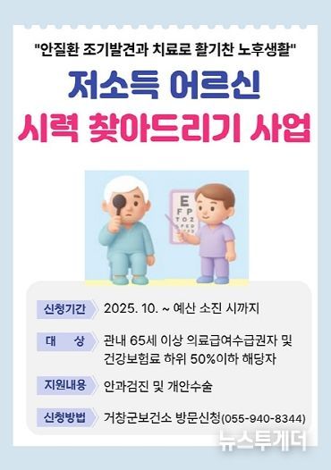 지원대상은 거창군에 거주하는 의료급여수급권자와 건강보험료 기준(직장가입자 127,500원 이하, 지역가입자 57,000원)에 해당하는 65세 이상 노인이다. 군은 안과검진과 개안수술을 지원함으로써 경제적 부담을 덜어드리는 동시에, 시력 저하로 인한 일상 속 불편을 해소하고, 삶의 질 향상과 사회적 고립 예방에도 힘쓰고 있다.