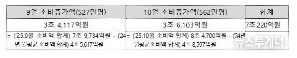 한편, 9·10월 환급(페이백) 지급 대상자(중복 포함, 1,089만명)가 작년 월평균 카드 소비액보다 총 7조 220억원을 더 지출한 것으로 확인됐다. 이는 지급액(6,430억원)의 11배에 달하는 규모다.