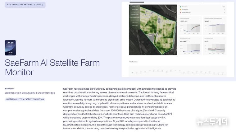 이 기술은 내년 1월 열리는 CES 2026에서 ‘SaeFarm AI Satellite Farm Monitor(새팜 농림위성 인공지능 분석)’ 서비스로 출품돼 공개될 예정이다.