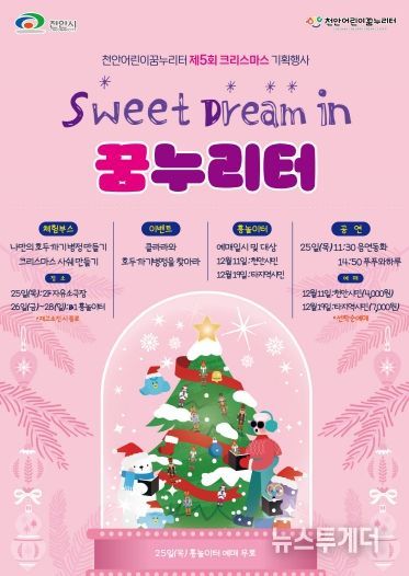 뉴스투게더 김인숙 기자 | 천안어린이꿈누리터(관장 조삼혁)는 오는 12월 25일부터 28일까지 제5회 크리스마스 기획행사‘Sweet Dream in 꿈누리터’를 진행한다고 밝혔다.