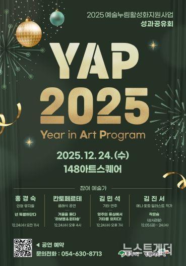 뉴스투게더 김인숙 기자 | (재)영주문화관광재단은 오는 12월 24일 148아트스퀘어에서 크리스마스 컨셉의 ‘2025 예술누림활성화 지원사업 성과공유회 'YAP 2025'’를 개최할 예정이다.