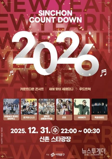 뉴스투게더 김인숙 기자 | 서대문구가 올해의 마지막 날인 이달 31일 밤 10시부터 새해 첫날인 1월 1일 0시 30분까지 신촌 연세로 스타광장에서 ‘2026 신촌 카운트다운 콘서트’를 개최한다.