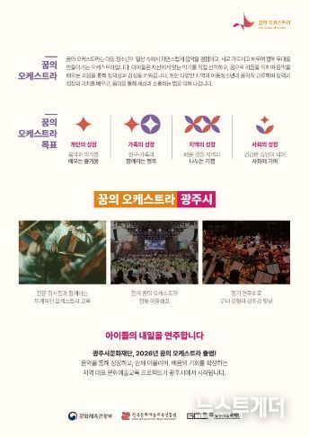 뉴스투게더 김인숙 기자 | (재)광주시문화재단은 문화체육관광부가 주최하고 한국문화예술교육진흥원이 주관하는 ‘2026 꿈의 오케스트라 운영사업’에서 예비 거점기관 단계를 거쳐 최종 신규 거점기관으로 선정됐다고 22일 밝혔다.