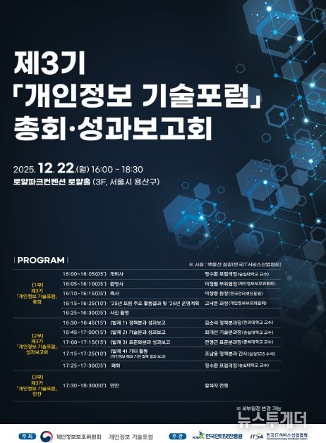 뉴스투게더 김인숙 기자 | 개인정보보호위원회는 12월 22일 서울 용산구에서 개인정보 기술개발 활성화 및 산업 생태계 기반 구축을 위한 제3기 '개인정보 기술포럼(의장 정수환 숭실대 교수)' 총회·성과보고회를 개최했다.