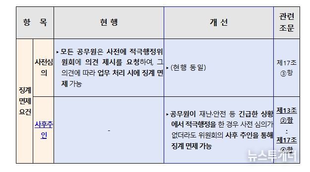기존에는 기관별 설치된 적극행정위원회의 사전 심의를 거쳐 업무를 처리한 경우에만 징계 면제가 가능했으나 긴급한 재난 상황 등에서는 사전심의를 받기가 사실상 어려운 현실을 반영해 사후에도 징계 면제가 가능토록 개선했다.