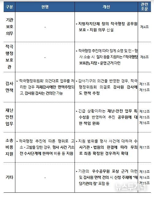 적극행정 추진으로 징계 소명 및 민·형사상 소송이 진행되는 경우 소속기관 차원의 보호·지원이 의무화되고, 적극행정 보호관을 지정해 공무원을 보호해야 한다.