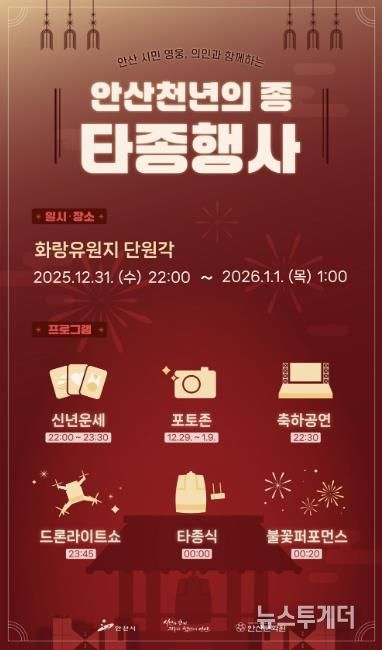 뉴스투게더 김인숙 기자 | 안산시는 오는 31일 오후 10시부터 화랑유원지 단원각에서 ‘2026 안산 천년의 종 타종 행사’를 개최한다고 30일 밝혔다.