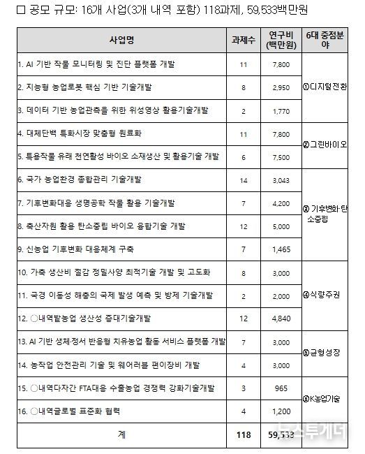 6대 분야는 다음과 같다. △미래 스마트농업 확산: 인공지능(AI) 기반 작물 모니터링 및 진단 플랫폼 개발, 위성영상 활용 기술 등(21과제, 약 125억 원) △바이오 및 푸드테크 산업 육성: 대체단백 특화시장 맞춤형 원료화, 특용작물 유래 바이오 소재 생산 등(17과제, 약 153억 원) △기후변화 및 탄소중립 대응: 축산자원 활용 탄소중립 기술, 신농업 기후변화 대응체계 구축 등 (40과제, 약 137억 원) △식량주권 확보: 밭농업 생산성 증대 기술, 가축 생산비 절감 정밀 사양 최적 기술 등 (22과제, 약 98억 원) △지역 균형성장 및 안전·행복한 농촌: 치유농업 활동 서비스 플랫폼 개발, 농작업 안전관리 및 웨어러블 장비 개발 등(11과제, 약 60억 원) △ 케이(K) 농업 국제적(글로벌) 확산: 다자간 자유무역협정(FTA) 대응 수출농업 경쟁력 강화 기술, 국제 표준화 협력 등(7과제, 약 22억 원)