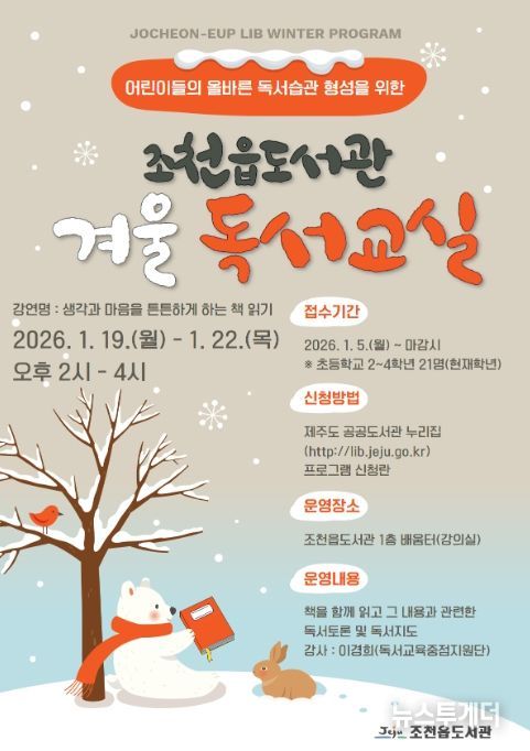 뉴스투게더 김인숙 기자 | 제주시 조천읍도서관은 초등학교 2~4학년을 대상으로 하는 ‘겨울 독서교실’ 참여자를 5일부터 선착순 모집한다.