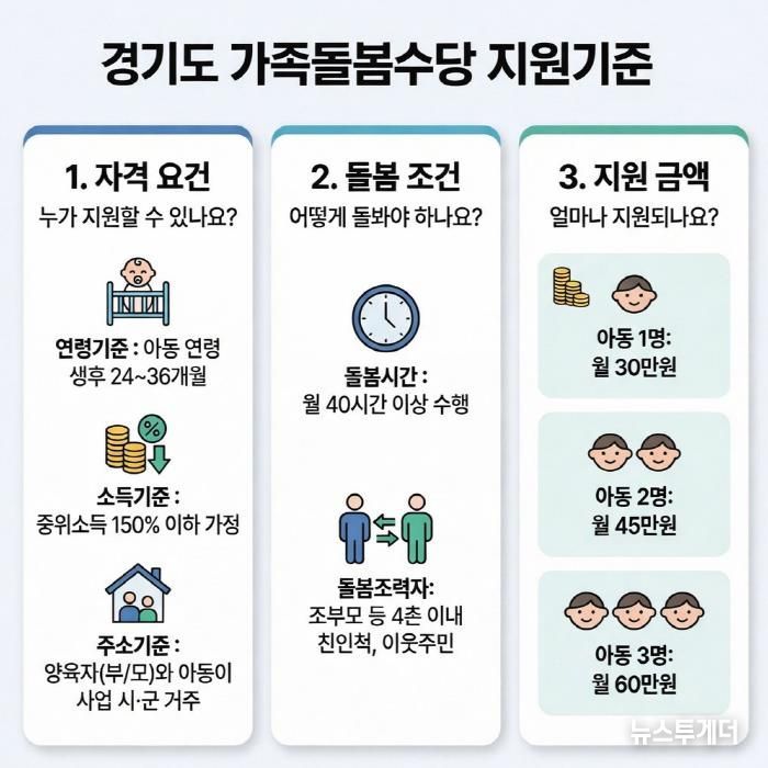 신청은 매월 1일부터 15일까지 경기민원24를 통해 온라인으로 가능하며, 돌봄활동 후 그다음 달에 수당이 지급된다.