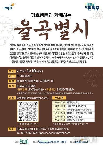 파주시환경센터 에코온 관계자는 “율곡별시는 단지 시험을 치르는 행사가 아니라, 가족과 아이들이 함께 참여하며 기후행동을 자연스럽게 경험하는 문화축제”라며 “미래세대인 청소년이 주체가 되어 기후 위기 대응의 가치를 배우고 실천으로 이어갈 수 있는 계기가 되길 바란다”라고 밝혔다.