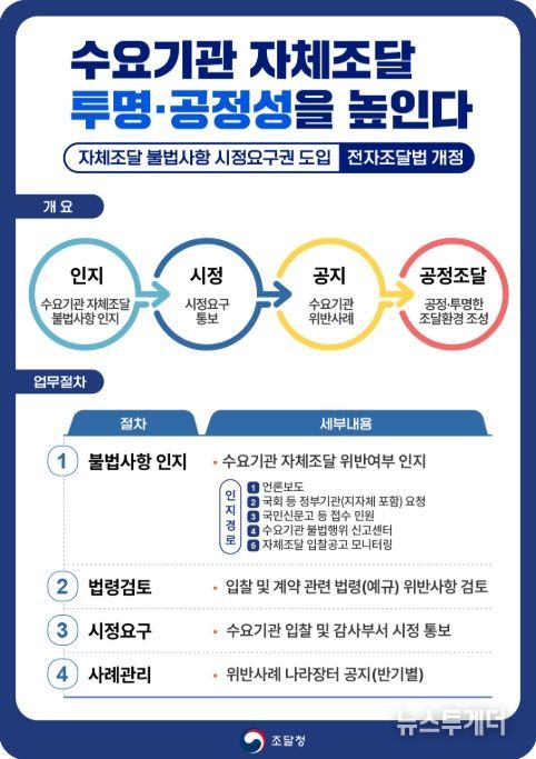 조달청은 '전자조달의 이용 및 촉진에 관한 법률'개정을 통해 수요기관 자체조달 과정에서 불법 및 법령위반 시 해당 수요기관에 입찰 공고 수정, 계약 조건 변경 등을 공식적으로 요구할 수 있는 시정요구권을 도입한다고 밝혔다.