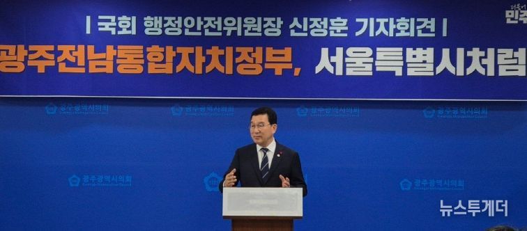 뉴스투게더 안상호 기자 | 신정훈 국회 행정안전위원장은 오늘 광주광역시의회에서 기자회견을 열고 “광주·전남 대통합을 통해 분권형 국가로의 대전환을 이루고, 대한민국 재도약의 길을 열겠다”고 밝혔다.