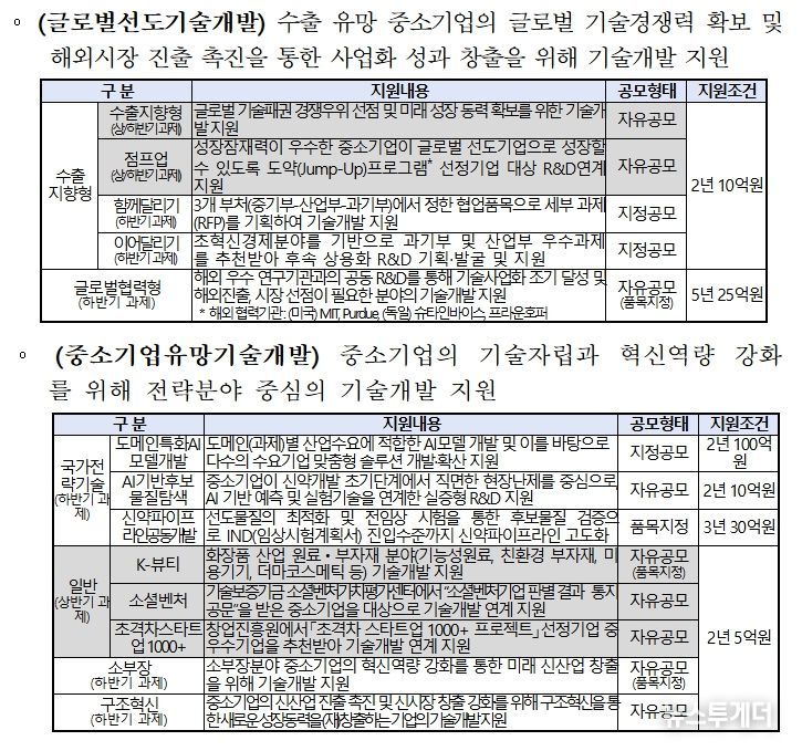 우선 ‘수출지향형’ 사업은 글로벌 시장 경쟁력 확보를 위해 기업당 최대 2년간 10억원을 지원한다. 특히 올해부터는 기존 124개 전략품목으로 제한했던 기술 분야를 전격 폐지해 중소기업이 자율적으로 혁신적인 과제를 제안할 수 있도록 했다. 다만 12대 국가전략기술이나 탄소중립 분야 등 전략기술 과제에 대해서는 평가 시 우대하여 정책적 일관성을 유지할 방침이다.