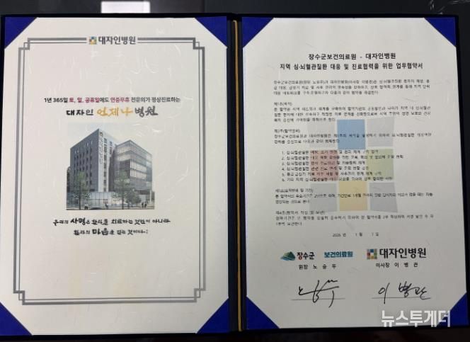 뉴스투게더 김인숙 기자 | 장수군은 대자인병원과 심뇌혈관질환 발생 시 신속하고 효과적인 대응을 위해 상호 진료협력 체계를 구축하는 ‘심뇌혈관질환 대응 진료협력 협약(MOU)’을 체결했다고 9일 밝혔다.