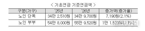 한편, 기초연금 기준연금액 역시 기초연금법에 따라 전년도 소비자물가상승률 2.1%를 반영하여, 2025년 34만 2,510원에서 2026년 34만 9,700원으로 늘어난다. 올해 기초연금을 받는 약 779만 명의 어르신들은 1월부터 인상된 기초연금액을 지급받게 되며, 기초연금 기준연금액의 인상을 위해 관련 고시를 1월 중 개정할 계획이다.