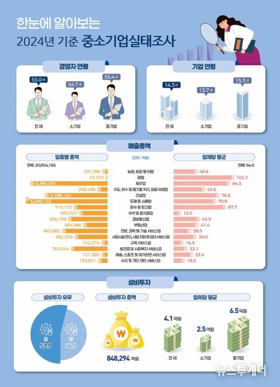 뉴스투게더 김성연 기자 | 중소벤처기업부는 '2024년 기준 중소기업실태조사' 결과를 발표했다. 중소기업실태조사는 중소기업의 경영 현황을 비롯한 실태 전반을 파악하여 중소기업 지원 정책 수립을 위한 기초자료로 활용하기 위해 매년 시행되고 있다.