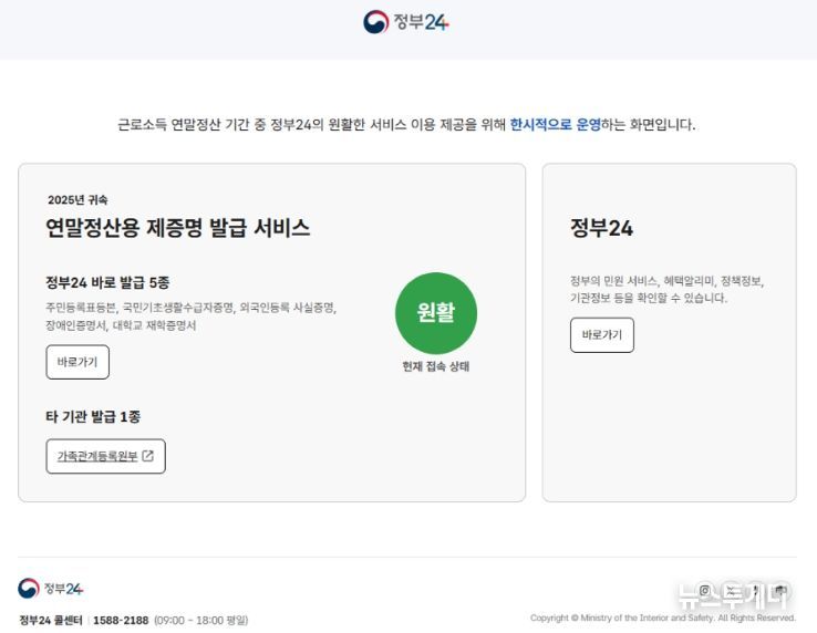 행정안전부는 연말정산 기간에 이용자 접속이 급증할 것에 대비해 전용창구를 운영하고, 접속 폭주 시 순번 대기 표시기능을 적용하는 등 이용자 불편을 최소화하여 정부24 운영의 안정성을 높인다는 계획이다.