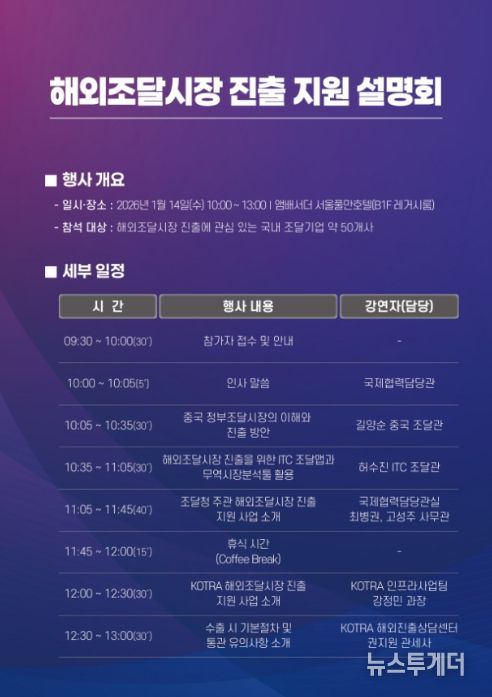 뉴스투게더 김성연 기자 | 조달청은 14일 앰배서더 서울 풀만호텔에서 조달기업 60여 개사를 대상으로 해외조달관 초청 ‘해외조달시장 진출 지원사업 설명회’를 개최했다.