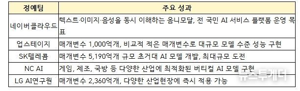 `25년 8월부터 「독자 AI 파운데이션 모델 프로젝트」 정예팀에 선발된 5개 팀이 치열한 경쟁을 통해 기술 혁신을 거듭한 결과, 정예팀이 개발한 AI 파운데이션 모델(`25년말 공개) 5개 모두 미국 비영리 AI연구기관 ‘Epoch AI’의 ‘주목할만한 AI모델(Notable AI Models)’로 등재되는 성과를 거두었다.