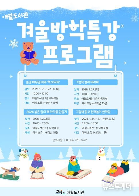 뉴스투게더 김인숙 기자 | 제주시 애월도서관은 겨울방학을 맞아 어린이들이 책과 놀이, 체험 활동을 통해 즐겁게 배우고 독서에 대한 흥미와 창의력을 키울 수 있도록 ‘2026 애월도서관 겨울방학특강 프로그램’을 운영한다.