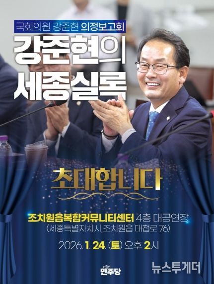 뉴스투게더 안상호 기자 | 더불어민주당 강준현 국회의원(세종시을)이 2026년 1월 24일 오후 2시, 조치원복합커뮤니티센터 대공연장(조치원읍 대첩로 76)에서 의정보고회를 연다.