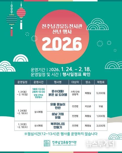 체험 프로그램은 1월 24일부터 현장 접수를 통해 참여 가능하며, 자세한 내용은 진주남강유등전시관 누리집 또는 전화(055-762-8583)로 문의하면 된다.