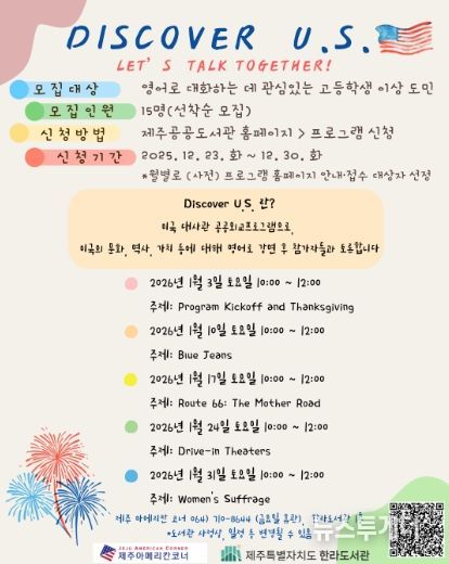 뉴스투게더 김인숙 기자 | 제주특별자치도 한라도서관은 주한미국대사관과 협력해 도민의 글로벌 이해와 영어 활용 역량 강화를 위한 교육 프로그램 ‘Discover U.S.’를 올해부터 운영한다고 밝혔다.